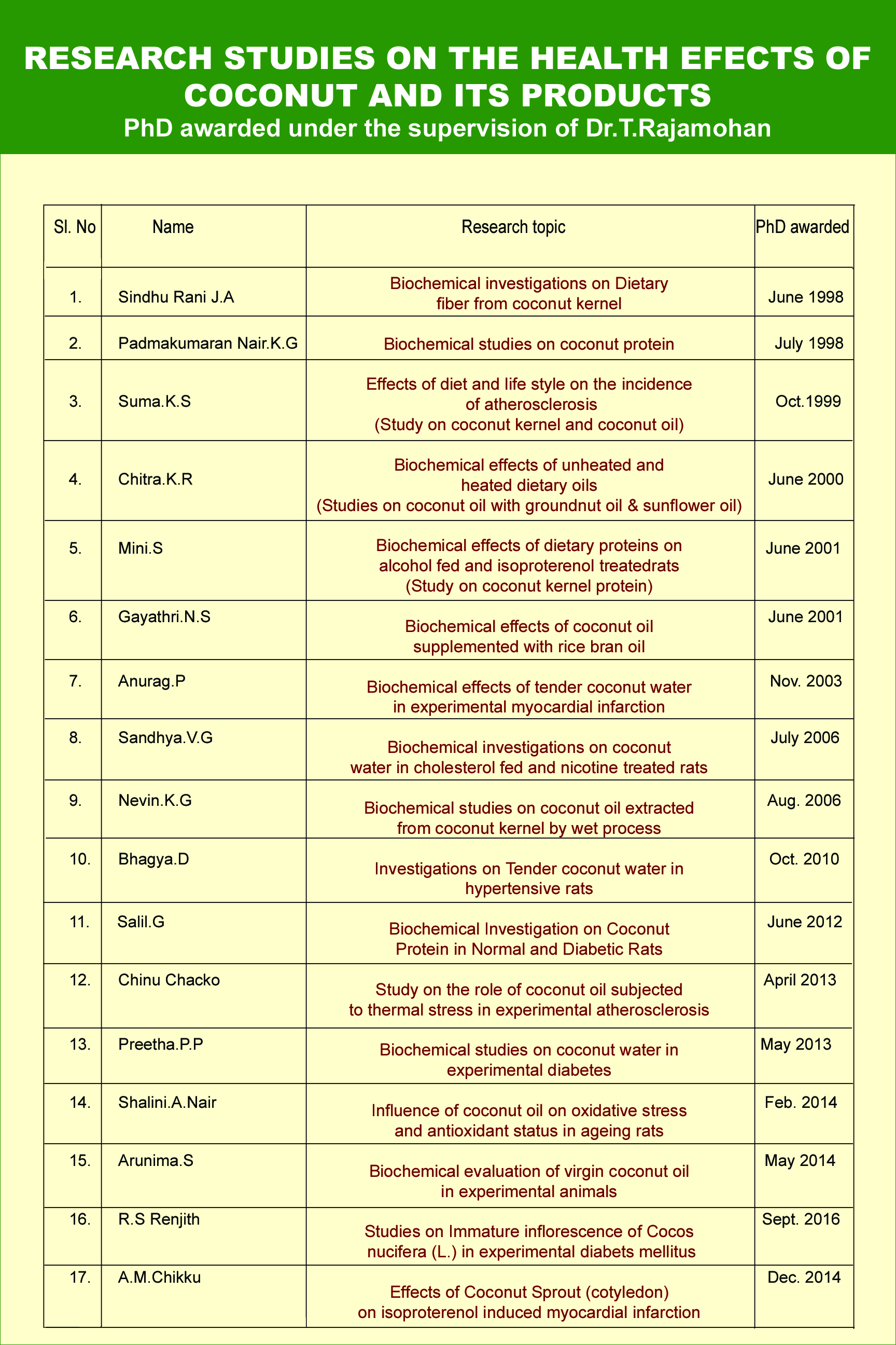Dr. T. Rajamohan was born at Thiruvananthapuram district of Kerala. He obtained his Masters Degree in Biochemistry from the Department of Biochemistry, University of Kerala in 1982 and joined for research under the guidance of Dr.P.A.Kurup and received PhD in 1990. In the meantime, he joined as Lecturer in Biochemistry, University of Kerala in 1983, and promoted as Reader in 1992, and as Professor from 1999 onwards. He worked as Professor and Head of the Department of Biochemistry during March 2009 to March 2012 and retired from University service in March 2013. As a researcher, he had significantly contributed to the studies on coconut and its products in health and disease for the last 24 years. During this period, he has supervised 17 Ph.D thesis based on the health aspects of coconut and its products. As an outcome of the work, he could publish 50 research papers in National and International Journals. He had participated as resource speaker in the 34th meeting of Asia and Pacific Coconut Community held at Philippines in 1997 and also presented papers in several National and International seminars. Several seminars and exhibitions on coconut and its products were organized by him. The research work carried out by him culminated in a National Award for Best Research Worker in 2010 instituted by Coconut Development Board, Ministry of Agriculture, Government of India, Kochi. After retirement, he continued his research on the health aspects of coconut and its products. To fulfill his dreams, he has taken initiative to establish a Coconut Research and Development Centre and continuing his research for the betterment of coconut community. .